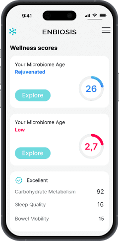 Minden ember mikrobiomája egyedi, akárcsak az ujjlenyomat. Születésétől fogva a mikrobiómára hatással van az, ahogyan született, milyen betegségekben szenvedett, milyen gyógyszereket használ és milyen stresszt tapasztal, és ez idővel változik. Az ENBIOSIS segítségével észlelheti a mikrobiom állapotát, és kezelheti azt az adott tápanyag pontszámával.